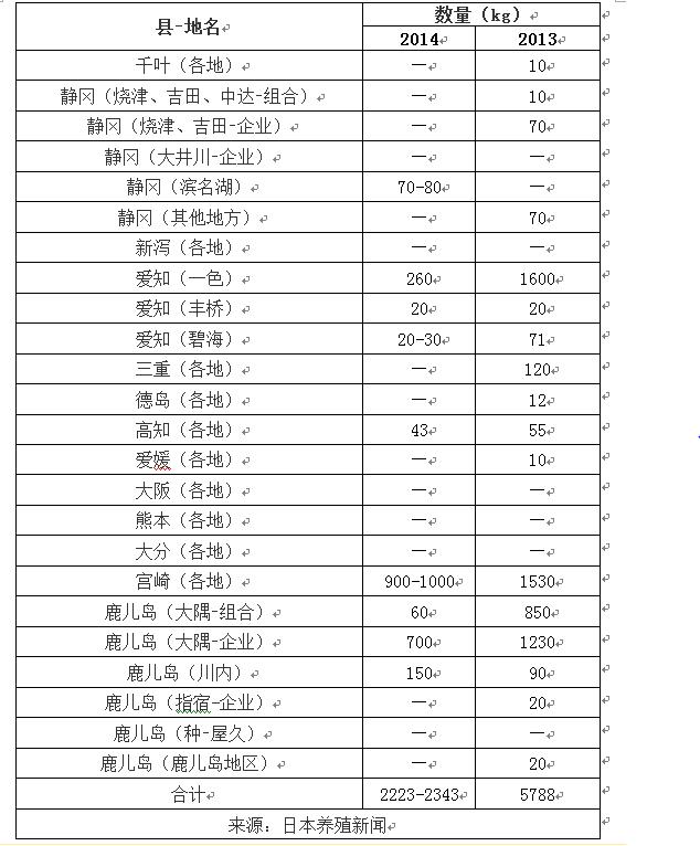 日本各地鳗苗入池情况(2014年12月21-26日)