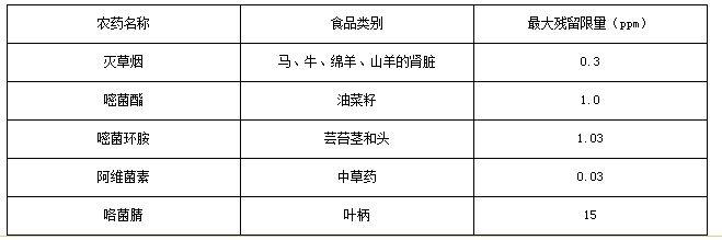 2016年7月8日,加拿大发布G/SPS/N/CAN/1002/Add.1至G/SPS/N/CAN/1004/Add.1、G/SPS/N/CAN/1008/Add.1至G/SPS/N/CAN/1010/Add.1通报,确定灭草烟(Imazapyr)、嘧菌酯(azoxystrobin)、咯菌腈(fludioxonil)、嘧菌环胺(cyprodinil)、阿维菌素(Abamectin)在部分商品中的最大残留限量。部分具体限量如下表: