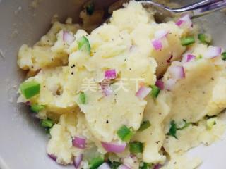 3、加入切碎的青椒丁和洋葱丁,拌匀。也可以将青椒丁和洋葱丁用少许油炒一下断生。我个人更喜欢吃爽脆的口感,所以用的生的