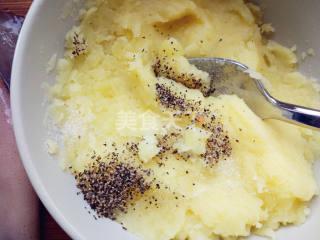 4、塞入鱿鱼筒内,内部塞紧,到八九成满。鱿鱼熟了之后会稍有收缩,把土豆泥向外挤,如果塞得太满,会溢出来了