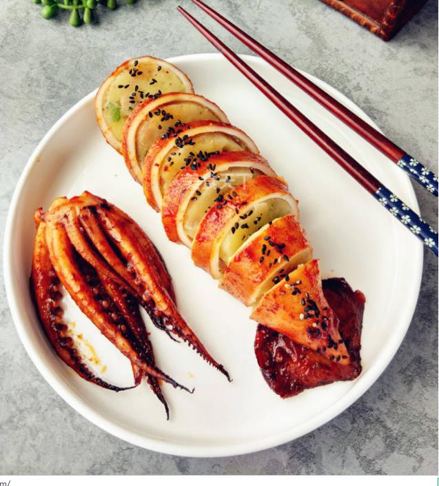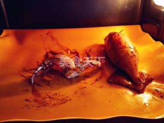 6、用牙签封好口,刷好上一步的辣酱,入预热好的烤箱中层,上下火180度烤8分钟左右,再翻面补刷辣酱,挪到上层烤3-5分钟。具体时间和温度要根据鱿鱼大小,烤箱实际炉温酌情增减