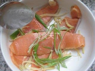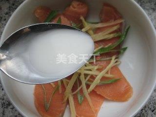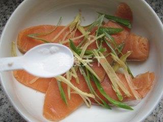 1、三文鱼切厚片放碗中,加葱姜丝、盐、少许料酒。