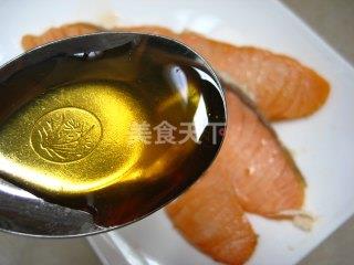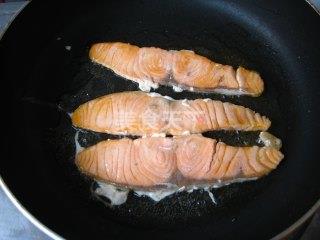 5、平底锅倒油烧至温热,放入腌好的三文鱼,用中火,煎至表面变色即可,时间不要太长免得破坏鱼肉的营养。
