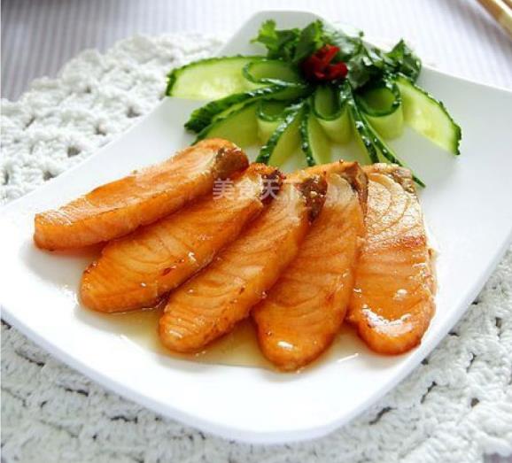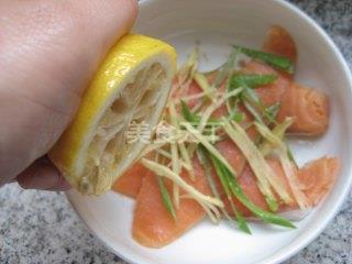 三文鱼适量、柠檬汁适量、蜂蜜适量、盐适量、料酒少许、水淀粉适量、葱姜丝适量