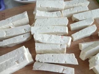 1、豆腐买来后控干水分,切成条,切块也可以。