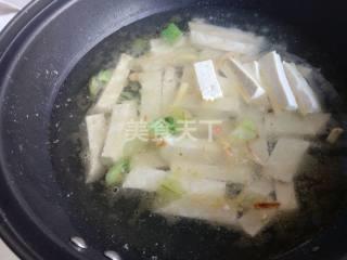 5、锅中再加少许油,爆香葱花、姜丝, 加豆腐、适量开水煮开。