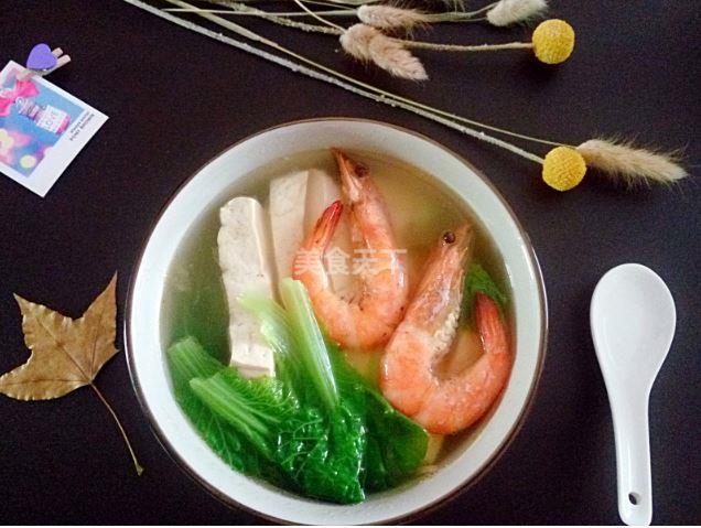 大虾4只、豆腐1块、小白菜适量、姜丝适量、葱花适量、盐适量、鸡精少许、胡椒粉少许、香油少许、料酒适量
