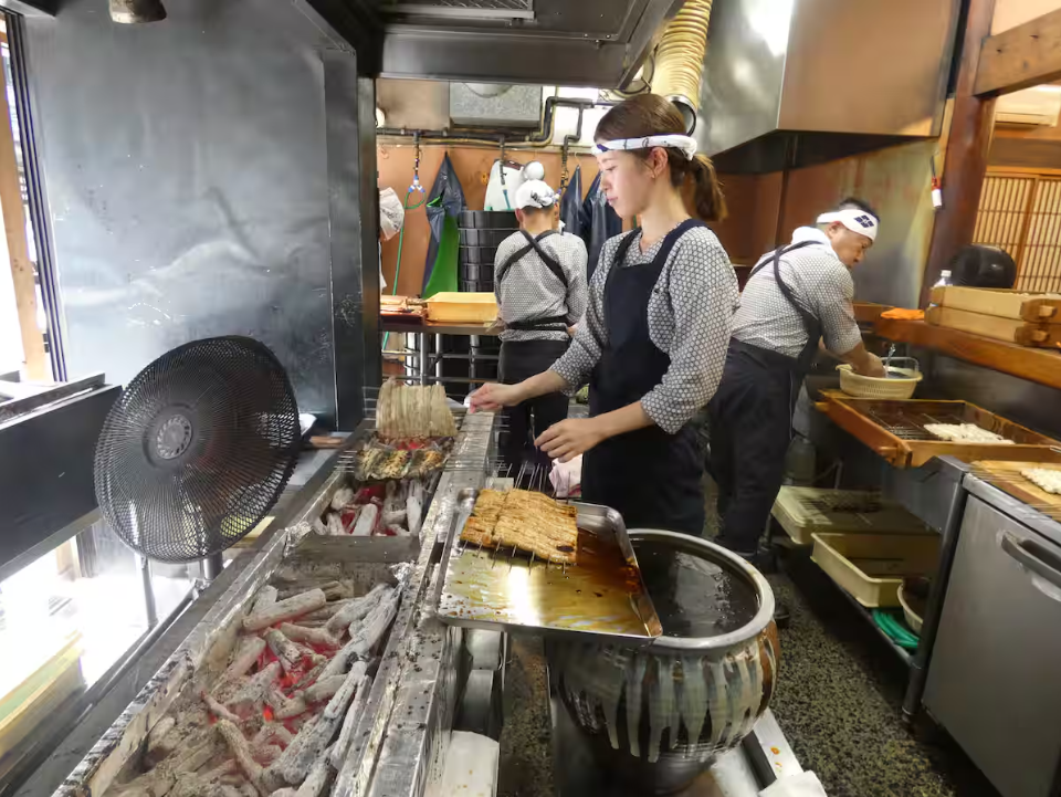 清晨的表参道,老字号“骏河屋”早已开始忙碌。这家始于江户时代的店铺保持着独特的经营方式——从处理鳗鱼到用备长炭烤制的全过程,都能从参道上清晰可见。烤制时散发的浓郁香气,不断刺激着过往游客的食欲。