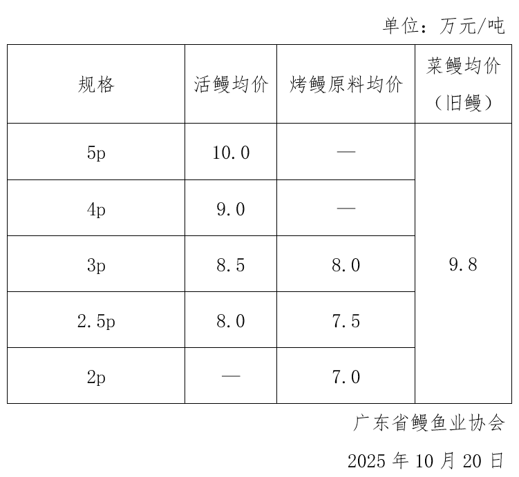 中国鳗鲡市场行情周报(至2025年10月20日)