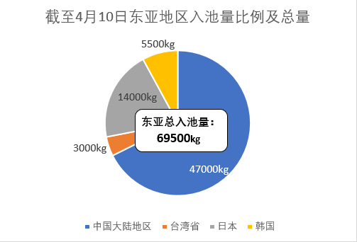 韩国:截至4月10日鳗苗捕捞总量为1200kg,从韩国鳗苗进口数据来看,上周(4月3日至9日),累计进口总量为4,367公斤,累计进口总金额达14,149,867美元,平均单价为517,136日元/公斤(按1美元=159.6日元换算),主要进口来源为日本、中国大陆(香港)及台湾省。