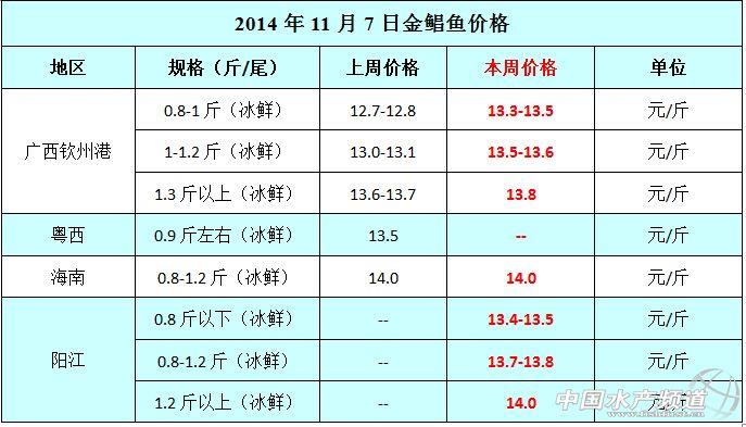 11月7日,广西、湛江、海南和阳江地区金鲳鱼的价格如下: