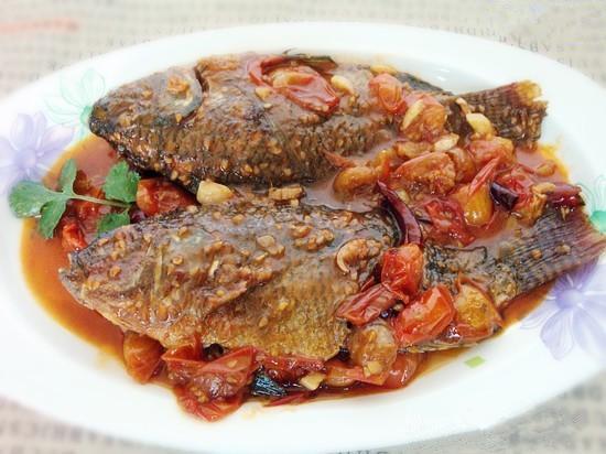 8.把煎好的罗非鱼放入蕃茄