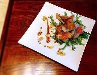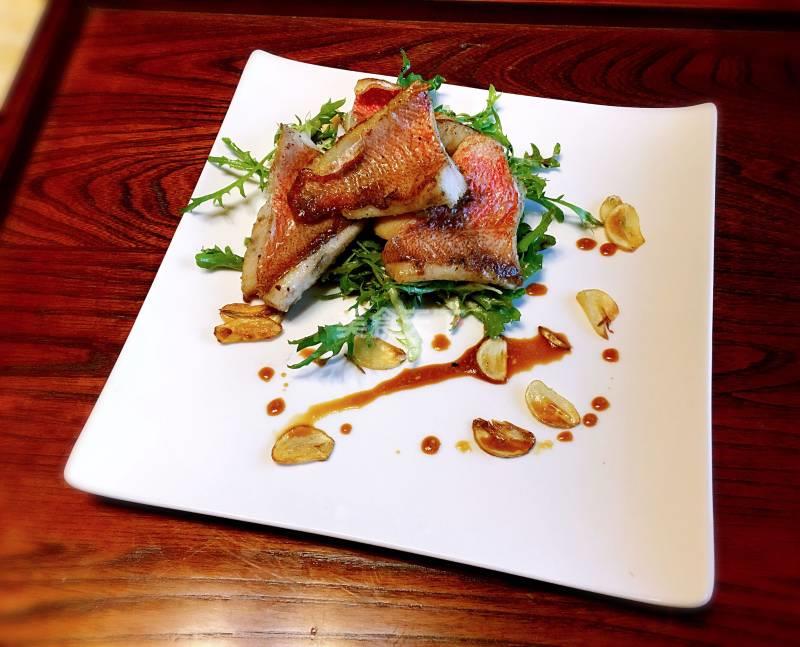 大西洋红鱼300g、苦菊50g、蒜瓣2个、沙拉酱10g、生抽2茶匙、盐10g、黄油25g、橄榄油3茶匙、柠檬1个、黑胡椒粉3g