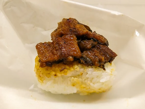 特色的鳗鱼饭团免费发放活动也吸引了大量民众排队参与。鳗鱼饭团每天限量发放500 个,分时段发放,第一次是上午11:00~12:30 ,第二次是下午13:00~14:30,每次发放前1 小时向前250 名到场游客发放兑换券,场面热闹非凡。值得一提的是鳗鱼饭团的材料都极具盛名,鳗鱼也是使用了“艳鳗”,米饭使用的是爱知县知名大米品牌“爱一粒”。“爱一粒”大米有三个“承诺”:承诺只有满足一定条件的注册生产商才可以栽培该品种,承诺100%使用最高品质的一等米,承诺严守蛋白质含量6.4%以下的标准(正常大米的标准为6.8%)。该大米通透发亮,烹饪出来的米饭颗粒分明,口感软糯弹牙带有甜味。可见只有搭配优质的大米才能充分品尝到鳗鱼本身的美味。