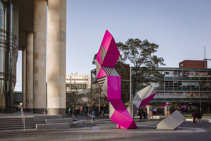 在帕拉马塔广场,艺术家雷科·伦尼(Reko Rennie)的《鳗鱼卧眠之地》以震撼的尺度呈现了这一主题。这座高达7.5米的地标性雕塑,描绘了两条从地底浮现的巨型鳗鱼,其名"Barramadda"在原住民语中正是"鳗鱼卧眠之地"的意涵。鳗鱼缠绕的身体既象征着历史上的人口迁移,也隐喻着社区的团结与联系。通过UAP团队精湛的工艺,33平方米的花岗岩与铝制面板被转化为承载文化记忆的媒介,使古老的传说在现代城市空间中焕发新生。