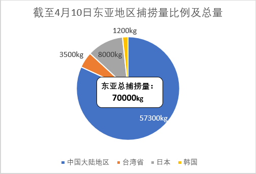 中国大陆地区:之前的捕捞势头完全消失。渔场方面,福建省南部已进入结束捕捞的氛围,仅剩上海部分地区和江苏省。多方相关人士称日捕捞量下降至50-70kg,也有信息表示是100kg/日。累计渔获总量为57,000公斤。